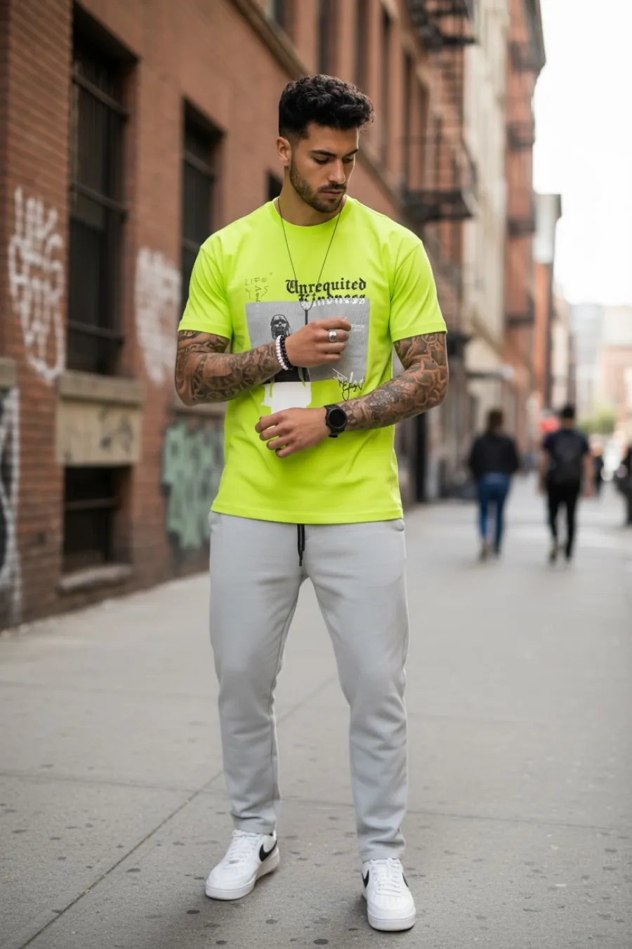 Tricou barbati galben neon, cu imprimeu, slim Y205 22A-5.2